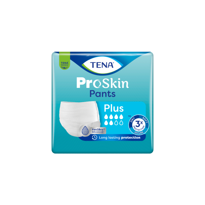 TENA ProSkin Pants Plus skyddande underbyxor skyddar upp till 100 % mot måttlig till svår urinläckage. De absorberar snabbt vätska och håller huden torr länge, dag som natt. Pålitliga engångsunderbyxor för en aktiv vardag, för både kvinnor och män.